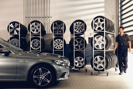 Damit Sie Ihre gewechselten Räder nicht den Rest der Zeit im Kofferraum herumfahren, lagern wir sie auf Wunsch auch gleich noch professionell ein.